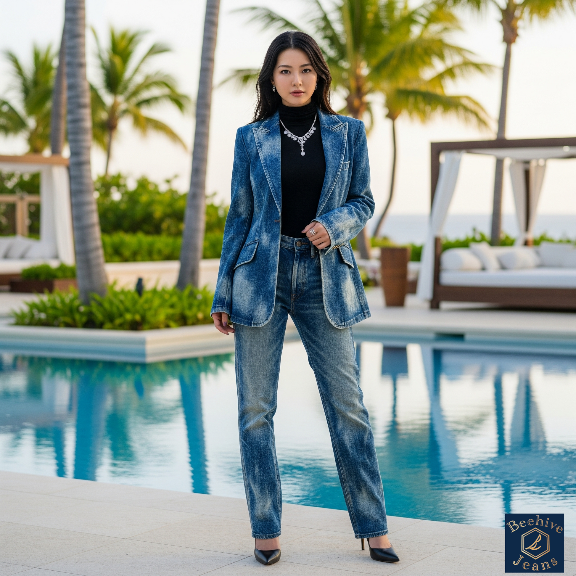《The Hive Jacket - Indigo Grace》は、カジュアルな中に品のあるシルエットを追求した、女性のためのデニムテーラードジャケットです。